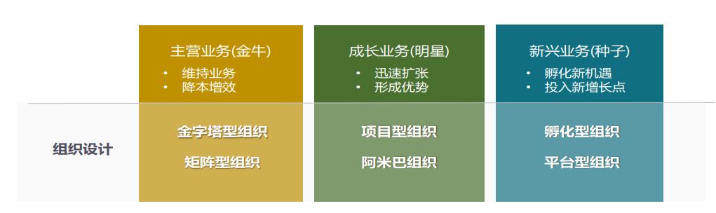 敏捷组织如何设计呢?首先厘清业务形态,然后基于主营业务,成长业务、新兴业务的轻重缓急采用适配的组织形态,就能够最大限度的让有限的人力资源腾挪移转,人力的排兵布阵更为灵活。