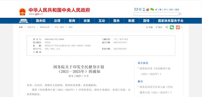 今年 8 月初,国务院印发《全民健身计划(2021—2025 年)》,进一步明确体育发展目标。提出到 2025 年,全民健身公共服务体系更加完善,人民群众体育健身更加便利,健身热情进一步提高,各运动项目参与人数持续提升,经常参加体育锻炼人数比例达到 38.5%,县(市、区)、乡镇(街道)、行政村(社区)三级公共健身设施和社区 15 分钟健身圈实现全覆盖,每千人拥有社会体育指导员 2.16 名,带动全国体育产业总规模达到 5 万亿元。