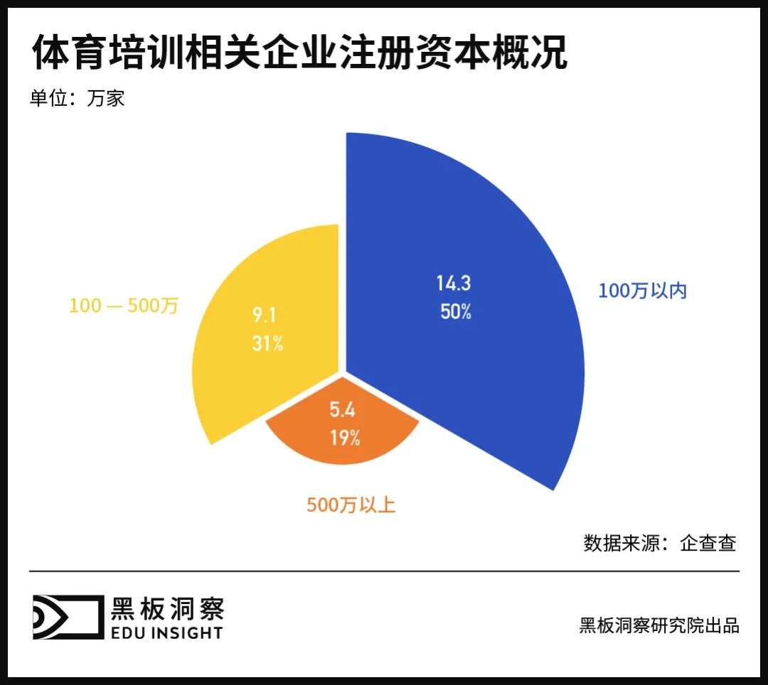 同时,对身处赛道多年的体培老玩家而言,以怎样的姿态面对这些新入局者,将成为日后继续发展下去的关键。当下体育培训行业基本处于大而杂的“混战格局”,企业数量虽然不少,但头部机构寥寥可数,仅从注册资本看,注册资本在 100 万元以内的企业数量占了 50%,行业多以中小型企业为主,能否应对好这轮冲击进而发展壮大,我们拭目以待。