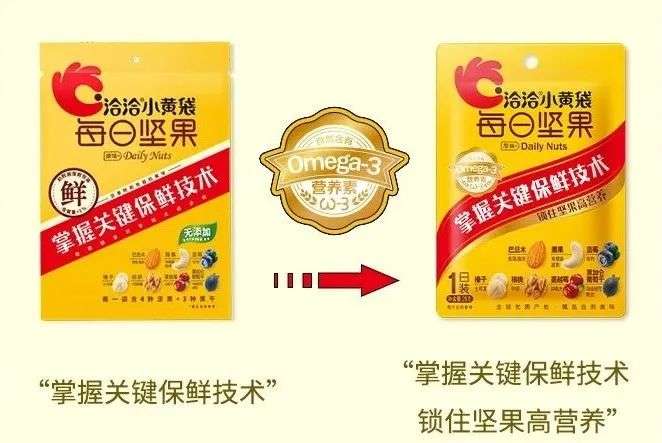 洽洽食品的黄袋坚果系列最早是在2017年,以每日坚果为代表,目前洽洽每日坚果系列已经开发小黄袋每日坚果,小蓝袋益生菌每日坚果,延伸的产品还有洽洽早餐每日坚果燕麦片等。