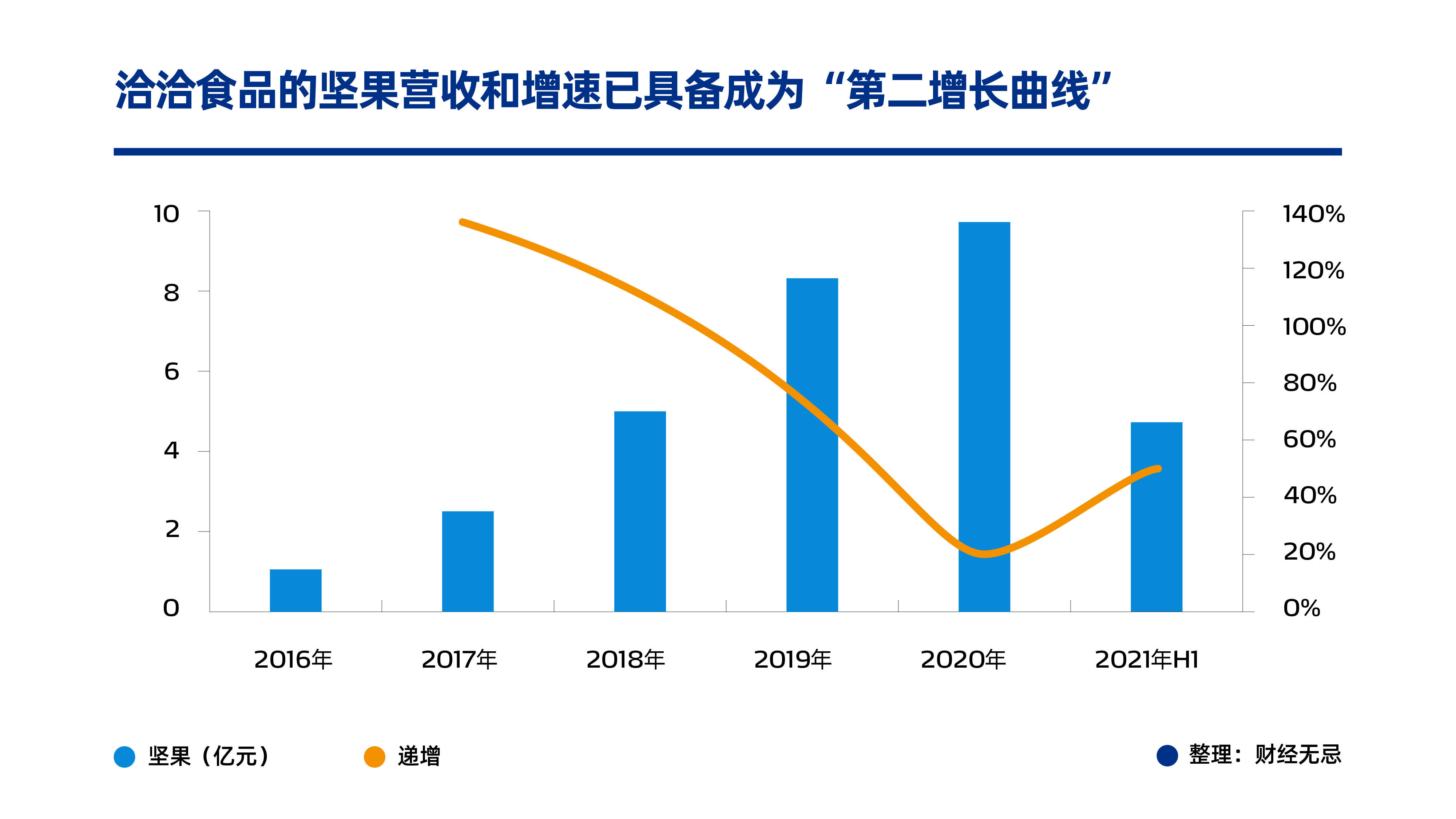 根据洽洽发布的百亿营收目标(含税)规划中,坚果品类将在2023年实现含税30亿元的目标,而目前坚果类产品也是洽洽增速最快的品类。