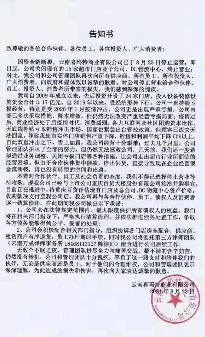 8月23日,在喜玛特超市发布的《告知书》中称,由于合作伙伴集中催款,停止供货,直接导致现在企业经营现金流断裂,再也没有转型的空间和出路。