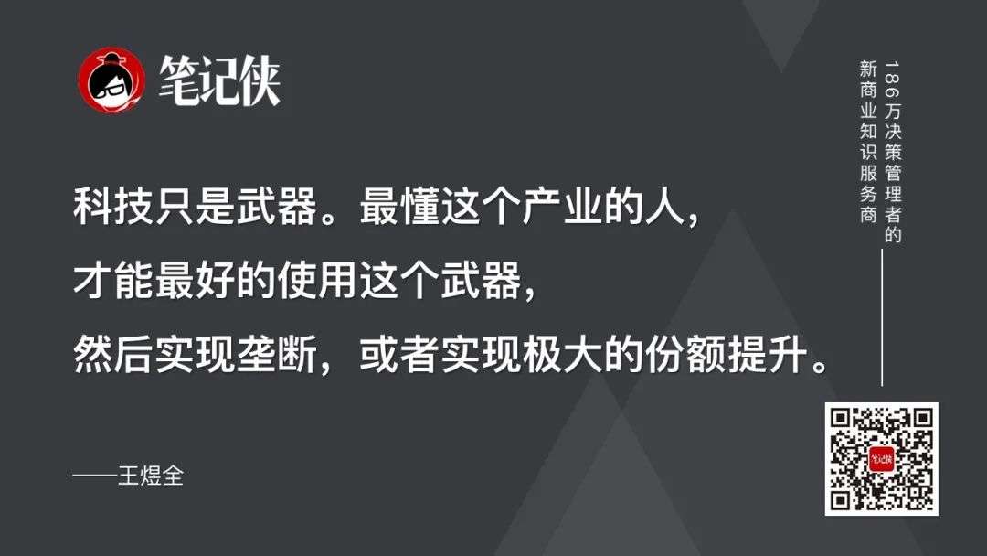 为什么?因为科技只是武器。最懂这个产业的人,才能最好地使用这个武器,然后实现垄断,或者实现极大的份额提升。