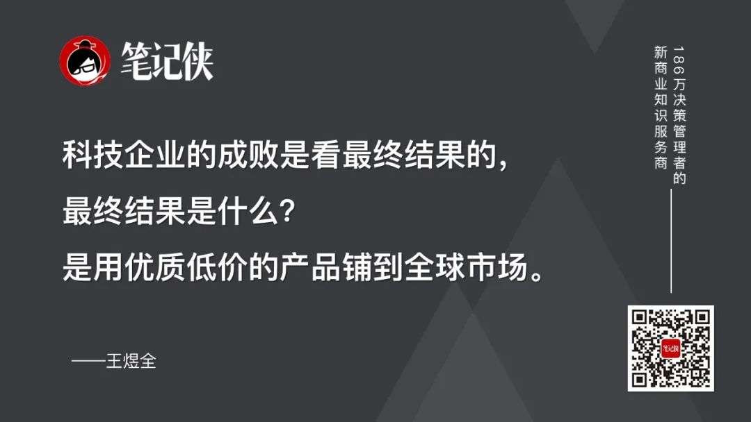 科技企业的成败是看最终结果的,最终结果是什么?是用优质低价的产品铺到全球市场。全球市场占有率决定了你的成败,中间缺一步都不行。