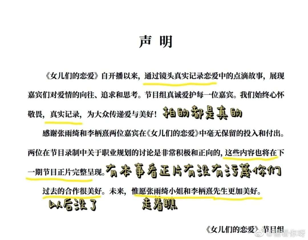 与此同时,网友开始醉心于解读节目组声明的“隐含意思”:既暗示了话都是嘉宾自己说的、没有恶意剪辑、不信正片见,那句“惟愿张雨绮小姐和李柄熹先生更加美好”又好似在阴阳怪气“倒要看看你们两个能走多远”。