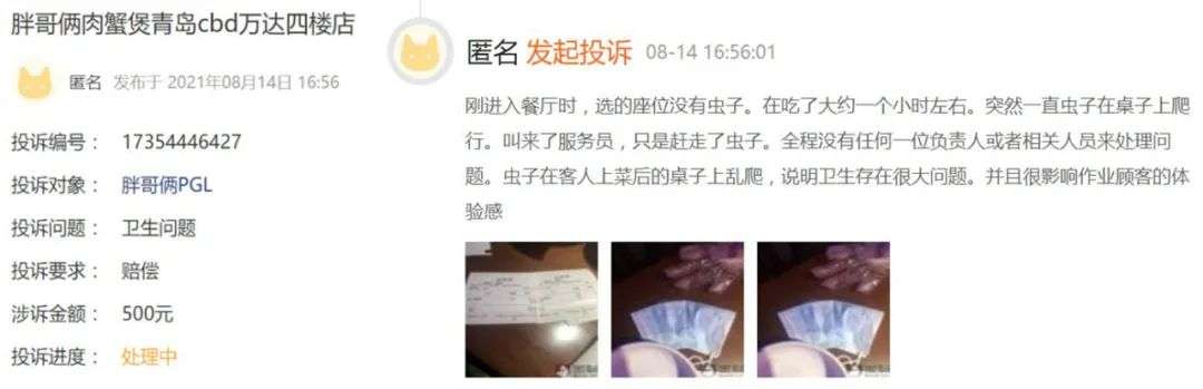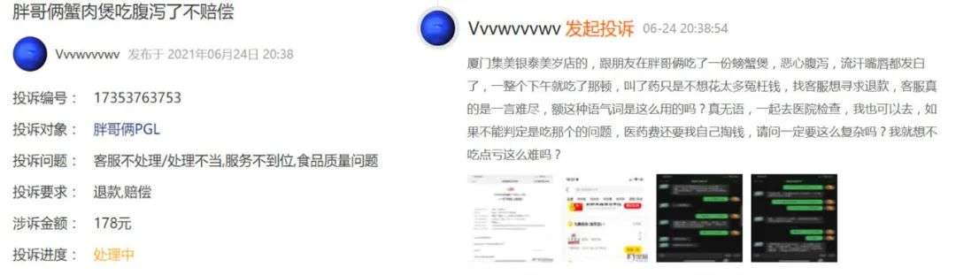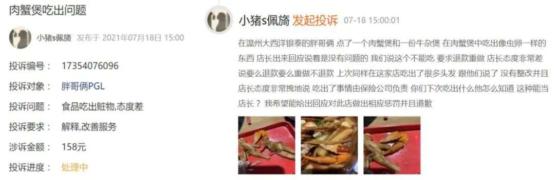 我们在黑猫投诉平台上,也发现了有关胖哥俩肉蟹煲涉食品安全的系列投诉,涉及多个城市的多家门店。