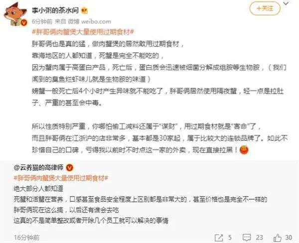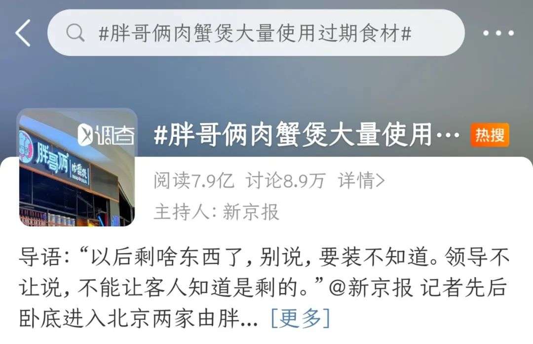 8月23日上午8点左右,周一上班的早高峰,很多网友被“胖哥俩肉蟹煲大量使用过期食材”的消息刷了屏,并在随后的短短2小时,胖哥俩肉蟹煲冲上了热搜第一名,引发海量媒体转发和大V评论的同时,也震惊了每一个吃货的神经。