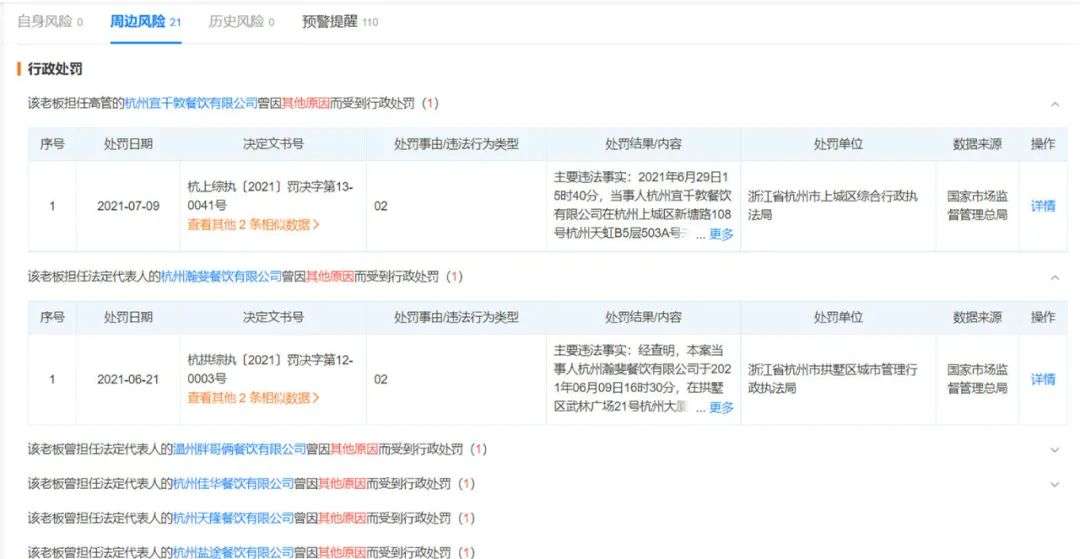 我们还发现,作为“胖哥俩”企业创始人与法人的张灵瀚,名下关联二十余家公司,并存在多条风险信息,包括但不限于未履行生活垃圾分类投放管理责任被处罚,因侵权责任纠纷被处罚等。