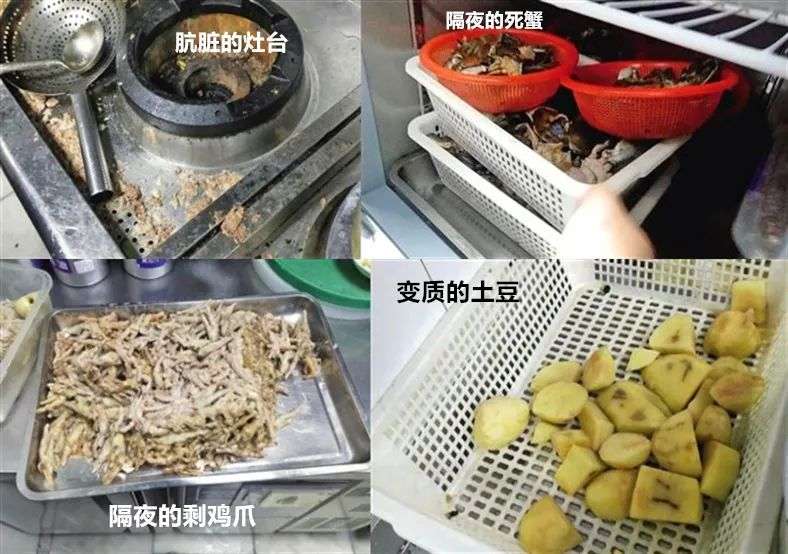 承诺现杀的活蟹,实际是前一天已经宰杀好的“隔夜蟹”,卖不完的死蟹洗一下接着卖;提前煮熟的肉品(比如鸡爪),即使变味也会留到第二天继续卖,过期发馊、腐烂变质的土豆简单加工继续送上食客的餐桌上,500g一份的肉蟹煲,店家授意只给430g…