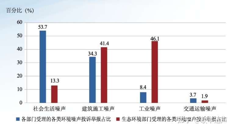 2020年,全国有61个地级及以上城市、353个县级城市完成了声环境功能区划分调整工作,据不完全统计,全国省辖县级市和地级及以上城市的生态环境、公安、住房和城乡建设等部门合计受理环境噪声投诉举报约201.8万件,其中,社会生活噪声投诉举报最多,占53.7%;建筑施工噪声次之,占34.3%;工业噪声占8.4%;交通运输噪声占3.7%。生态环境部门“全国生态环境信访投诉举报管理平台”共接到公众举报44.1万余件,其中噪声扰民问题占全部举报的41.2%,排各环境污染要素的第2位,广西、重庆的环境噪声投诉举报占本地各类环境污染举报的比例,甚至接近或超过60.0%。