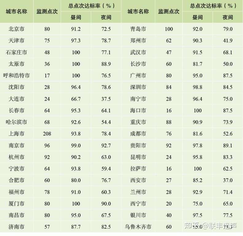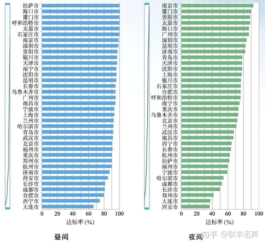 从城市看,拉萨、海口、厦门、石家庄、太原、呼和浩特白天的达标率都是100%,南京、深圳白天达标率分别为99%和98.8%,也是相当不错的。出乎意料的是,白天最吵的大城市是大连,达标率仅为66.7%。达标率排在倒数第二的是西宁,只有75.0%。而夜晚总点次达标率达到90%以上的大城市只有两个,南京以92.7%夺冠,厦门以90.0%位列第二,这两个城市的小伙伴可以享受安静的夜晚。与之相对照,西安、大连夜间的达标率仅为37.0%和37.5%,低得有点离谱;郑州达标率41.9%、长沙达标率50.0%,成都、哈尔滨、宁波也都没到60%。