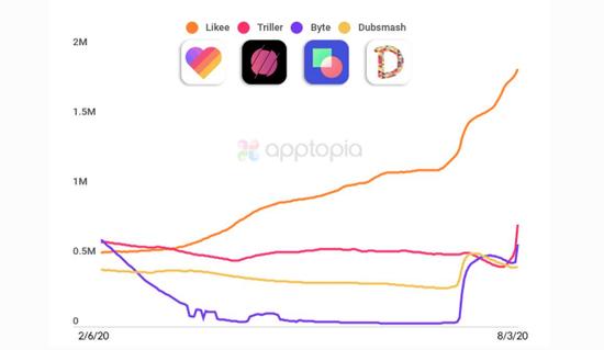据Apptopia数据显示,在去年2月至8月间,Likee在美国的应用安装量远超Triller、Byte和Dubsmash这几家短视频,8月其月平均活跃用户数已经达到了1.5亿,相比去年同期猛增86%。