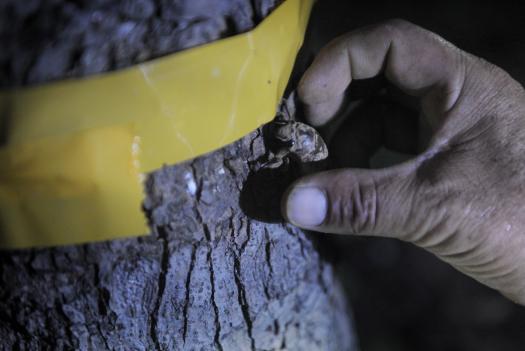所以到一些兼做知了猴养殖的果林里,你会发现每棵树上都缠着透明胶,那不是果树受伤了,而是为知了猴精心设下的陷阱。