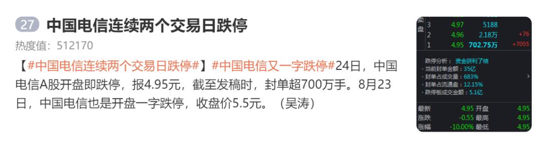 大起大落之下,中国电信跌停迅速引发广泛关注,并于23、24日两天登上微博热搜。