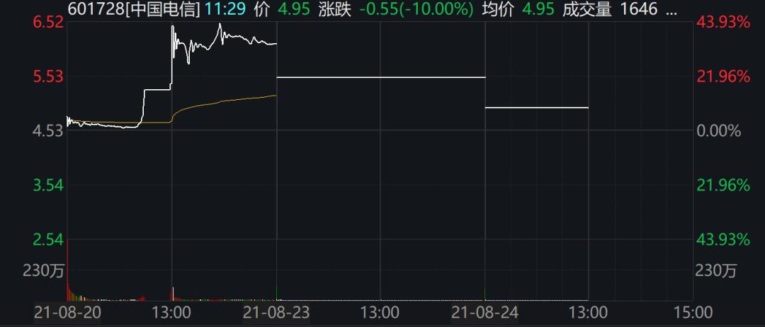 中国电信于8月20日在A股上市,当天盘中差点破发,不过,临近午间时,大量资金突然涌入,8分钟的时间内,中国电信股价从涨幅不到2%飙升到16.34%,触发盘中停牌;午后公司股价继续大涨,一度触及涨停(+44%),最终收涨34.88%,报6.11元/股,全日成交201.06亿元,换手率67.14%,总市值超过5000亿元。