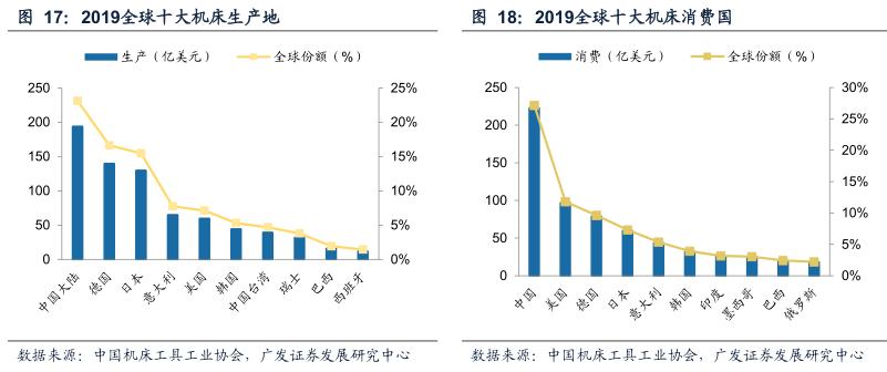 从数据看,中国已经成为全球制造业的中心,2009年以来,一直稳居世界第一大机床生产国、消费国和进口国的位置。2019年数据显示,我国机床生产总额为194.2亿美元,全球占比23.10%,机床消费总额为223亿美元,全球占比27.16%。