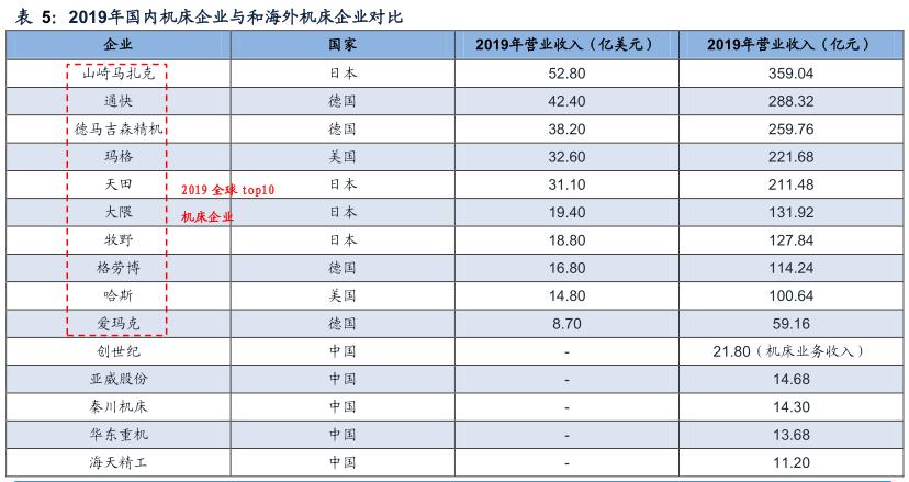 根据Wind及赛迪顾问数据,2019年全球十大机床企业中日本企业4家,德国4家,美国2家,其中日本机床龙头企业山崎马扎克2019年营业收入359.04亿元,而我国营业收入最高的10家机床企业2019年营业收入之和仅为112.54亿元,为山崎马扎克一家营业收入的31.34%,我国机床企业盈利能力远远低于海外巨头。