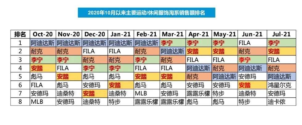 其中的第二点,是业内普遍认为李宁等国货服装行业崛起的核心因素——特别是当该行业出现“野性消费”趋势之后。据东吴证券梳理:2021年3月以来,耐克、阿迪达斯等国外服饰龙头在淘系销售额排名下跌,而李宁、安踏、鸿星尔克等呈现上升趋势。