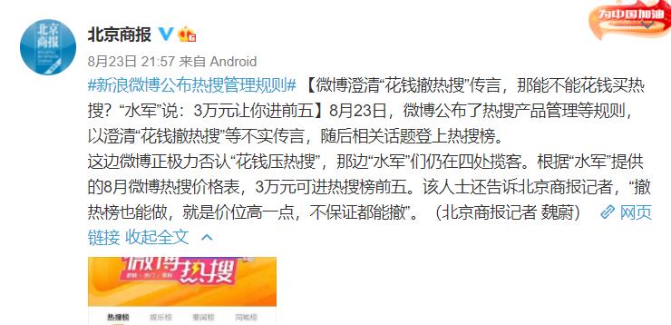 关于微博热搜的问题,坊间一直流传有许多传闻,如“只要肯花钱就能上热搜”,“热搜不同排名的价位不同,想要上高位要砸钱”,“对自己不利的热搜同样可以压制或撤销”。可以说,坊间对微博热搜的传言都离不开钱,即微博热搜存在人为调控的商业化行为。