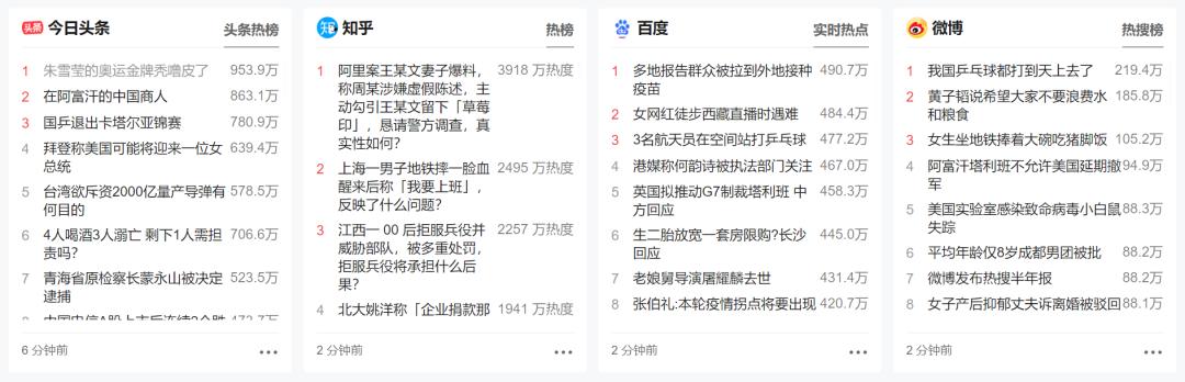 对比的四个榜单分别是今日头条、知乎、百度和微博,可以说每个平台都带有自己平台的特色。除了都有社会实事外,每个平台的高位话题基本都不太一样,如今日头条热榜的第一名是“朱雪莹的奥运金牌秃噜皮了”,知乎热榜的第一名是关于前段时间阿里案件的进一步讨论。头条和百度的榜单更注重最新实事,知乎偏向某件事的讨论,微博则既有实事也有娱乐相关的话题。
