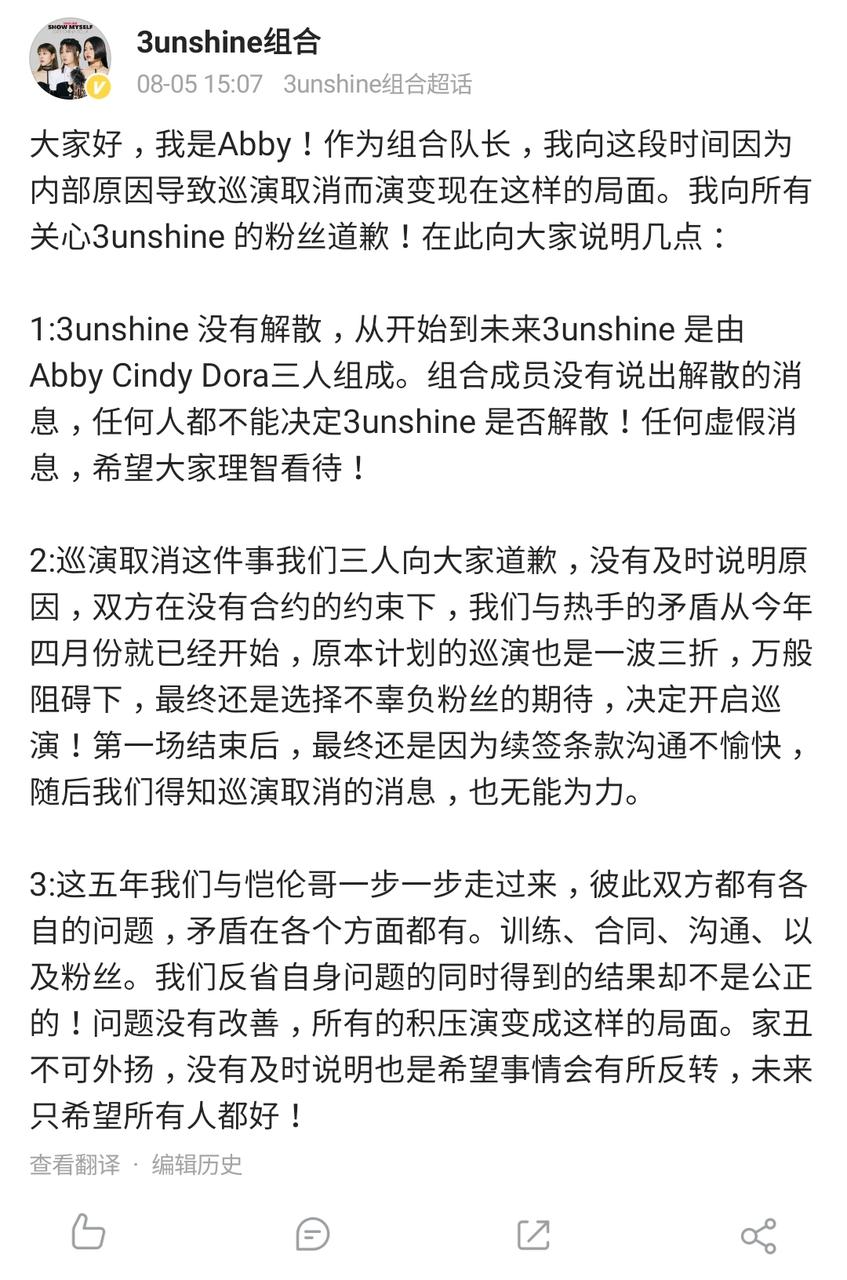 如今3unshine迎来出道五周年,虽然口碑在慢慢变好,但从队长Abby的发文中还是可以看出组合之后的经营仍然不容乐观。