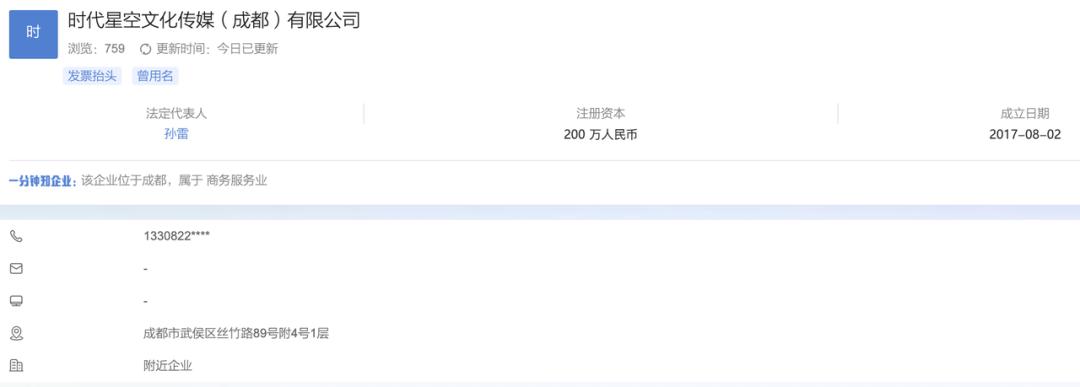 天府少年团背后公司ASE亚洲星空娱乐,其注册名为时代星空文化传媒(成都)有限公司,法定代表人是孙雷。