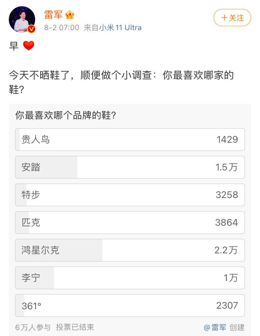 更值得关注的是,小米董事长雷军也是国产运动品牌们合作的对象。众所周知,雷军经常为小米的品牌宣传、站台。从今年开始,在雷军的晨跑微博中,经常会出现安踏、李宁、鸿星尔克等的身影,雷军还亲自为这些品牌发起了投票。