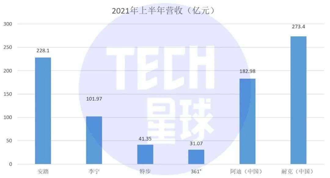 8月24日,安踏的表现则更为突出。据安踏的半年报显示,2021年上半年营收达228.1亿元,同比大增55.5%,并超过了同期阿迪达斯中国的182.98亿元。