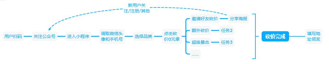 用户扫描海报——关注公众号——点击小程序——调用微信手机号、头像信息/注册登陆——选择品类——砍价0元拿——喊好友砍价/额外砍一刀/超级一刀等——砍价完成——填写地址领奖