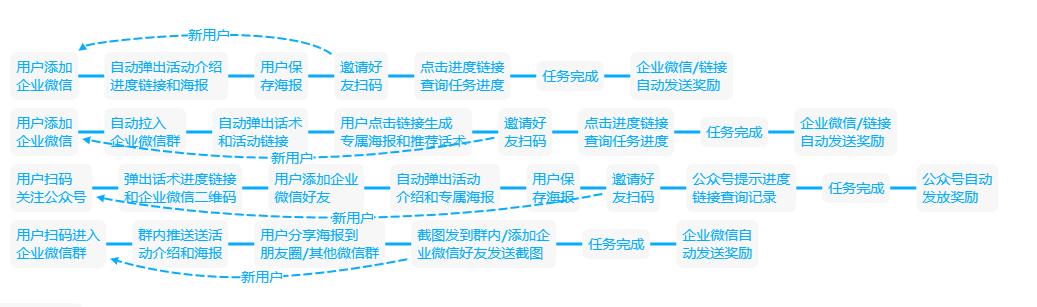 玩法三:用户扫码关注公众号——公众号弹出话术、进度链接、企业微信二维码——用户添加好友——自动弹出话术、专属海报——用户保存海报——发送好友扫码关注公众号——公众好提示进度——任务完成——公众号自动发放奖励