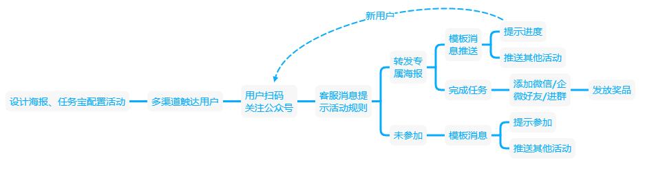 用户扫码关注公众号——微信客服消息提示活动规则——分享专属海报——模板消息提示任务进度——完成任务——发放奖品/提示进群领大礼包