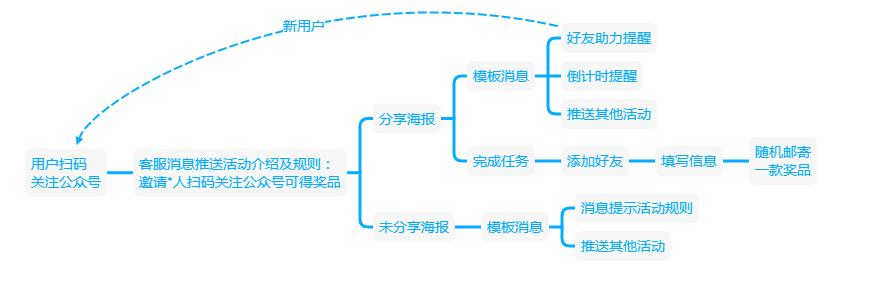 用户扫码关注公众号——微信客服消息提示活动规则——分享专属海报——模板消息提示任务进度——完成任务——填写收货地址/进群——随机邮寄一款奖品