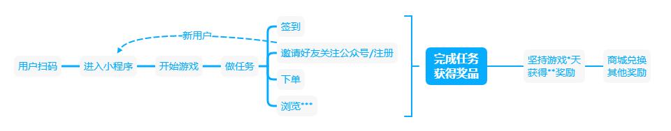 用户扫码/公众号——进入小程序——调取微信手机号和头像信息/注册登陆——开始游戏——做任务(签到、邀请好友关注公众号/注册、下单、浏览……)——完成任务获得奖励(水/肥料/金币等)——坚持**天获得***奖励——商城兑换其他奖品等