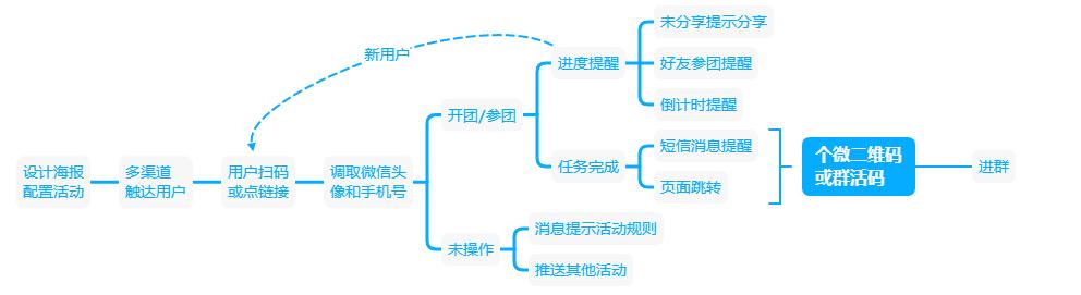 多渠道触达用户——用户扫码/点链接进入——登陆/注册——点击我要开团/参团——支付成功——提示分享邀请好友参团——已成团——个微/群活码——进群