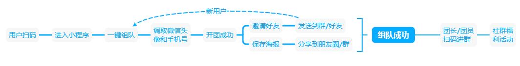 用户扫描海报/公众号——进入小程序/链接——一键组队——调取微信手机号和头像信息/注册登陆——开团成功——保存海报邀请好友扫码——组队完成——获得奖品——团长和团员扫码进群——社群福利活动