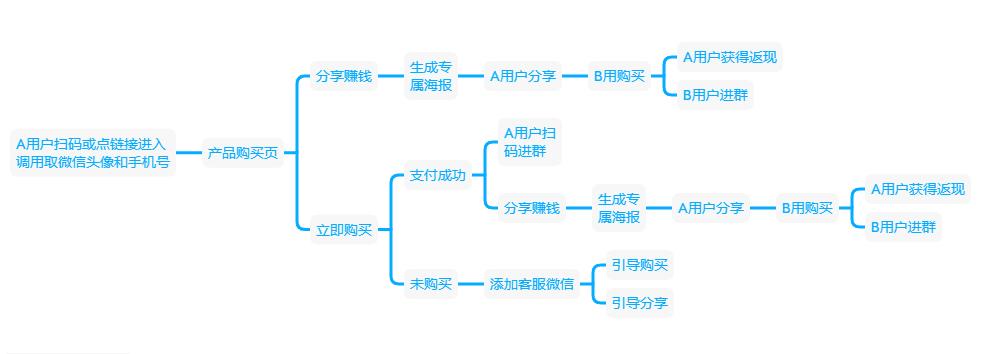 A用户扫码/点链接进入——点击分享赚钱按钮——生成专属海报/推荐文案——B用户购买——A用户获得返现——B用户进群(购买页、短信、公众号提示)