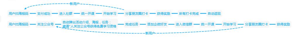 打卡返现型:用户扫码/点链接下单——支付成功——获得学习权限、进入社群——统一开课——开始学习——分享朋友圈打卡——获得奖励——所有打卡完成——获得返现