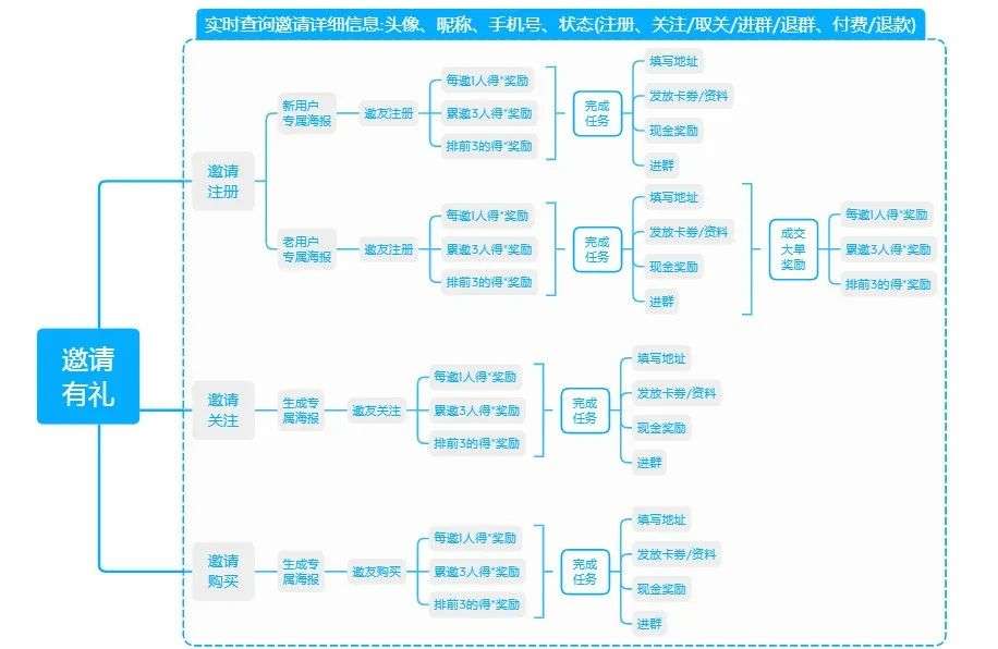 用户扫码/点链接进入活动——登陆/调取微信头像和手机号——生成专属海报/推荐文案——邀请好友注册/购买产品/关注公众号——查看邀请用户的信息及状态——完成阶梯任务——填写信息登记领奖