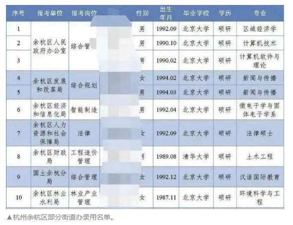 还有之前火遍全网的余杭区街道办招聘公示。在拟录用公示名单里,清一色是来自清华、北大的毕业生,学历硕士起步,博士不乏其人。