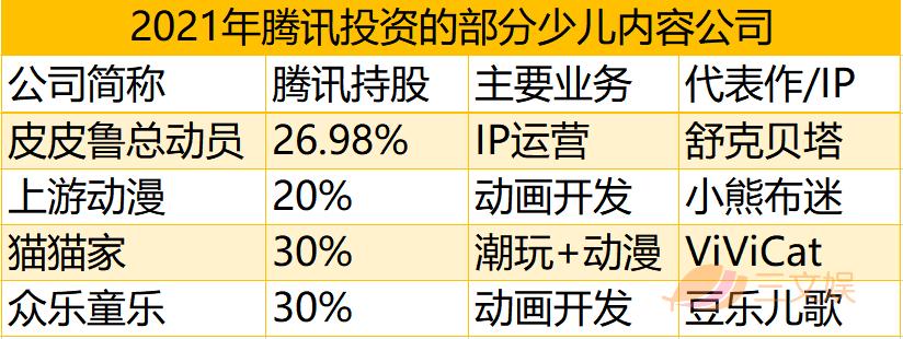 腾讯投资了皮皮鲁总动员、上游动漫、猫猫家、众乐童乐等少儿内容公司。
