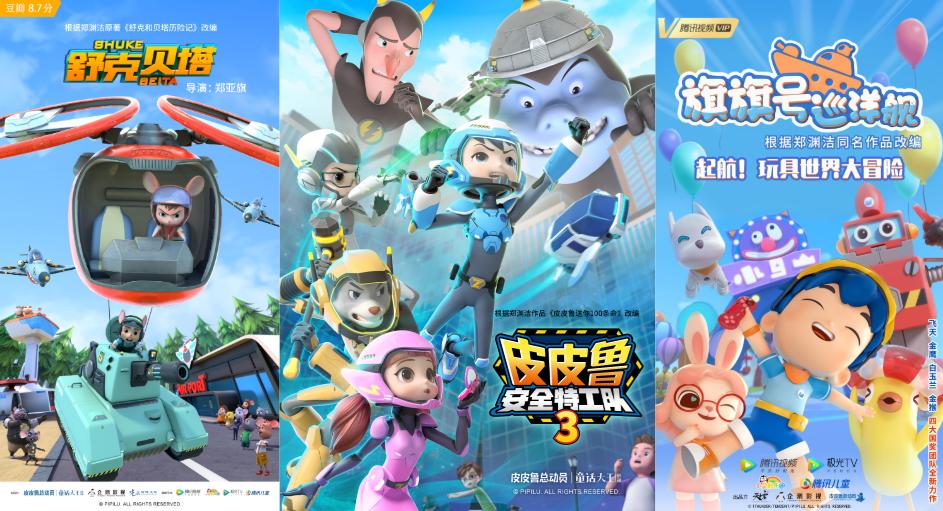 电影方面,皮皮鲁总动员的《驯兔记》是广电总局2018年度优秀网络电影短片作品,豆瓣评分8.3,全网累计1亿播放量; 原定于 2 021年8月在全国院线上映的 真 人儿童电影《罐头小人》,因疫情改期; 合家欢向 动 画电影《舒克贝塔》 计划于2023年制作完成 ; 奇幻动画电影《魔方大厦》 计划于2024年上映 。