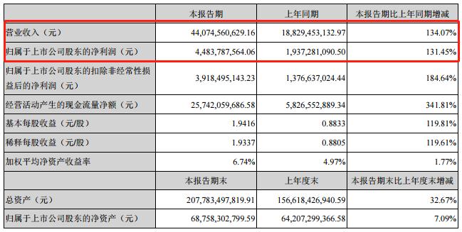25日晚间,宁德时代公布了上半年业绩报告,财报显示,公司上半年实现营业总收入440.75亿元,同比增长 134.07% ;实现净利润为 44.84亿元 ,同比增长 131.45% 。