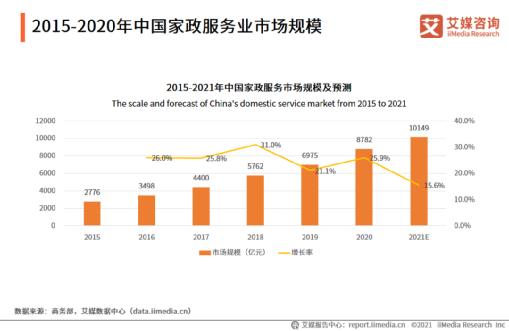 据艾媒数据显示,2015年至2020年中国家政服务业市场规模逐年稳步增长,2015年中国家政行业市场规模仅为2776亿元,2020年达到8782亿元,同比增长约26.0%。预计2021年中国家政行业市场规模将超过万亿元。