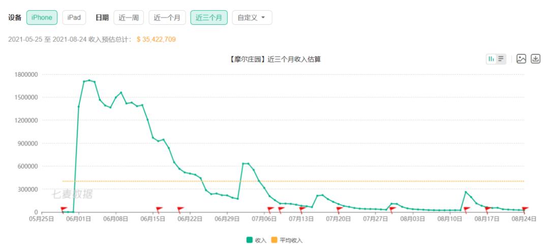 即便是公测两个多月后还能登上微博热搜头名的《摩尔庄园》,也无法摆脱后续营收乏力的魔咒,该游戏在ios平台的日流水已经从顶峰时期的近200万美元跌到只有2万出头。