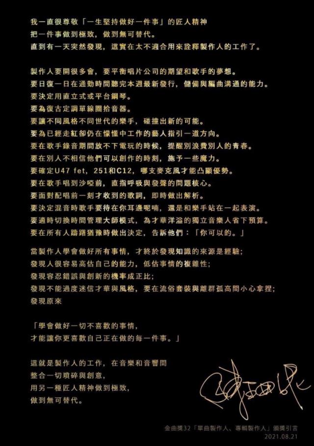 陈珊妮在金曲奖上用了大约120秒来阐述“音乐制作人”这个职业,简单概括就是:定调子与做决定。