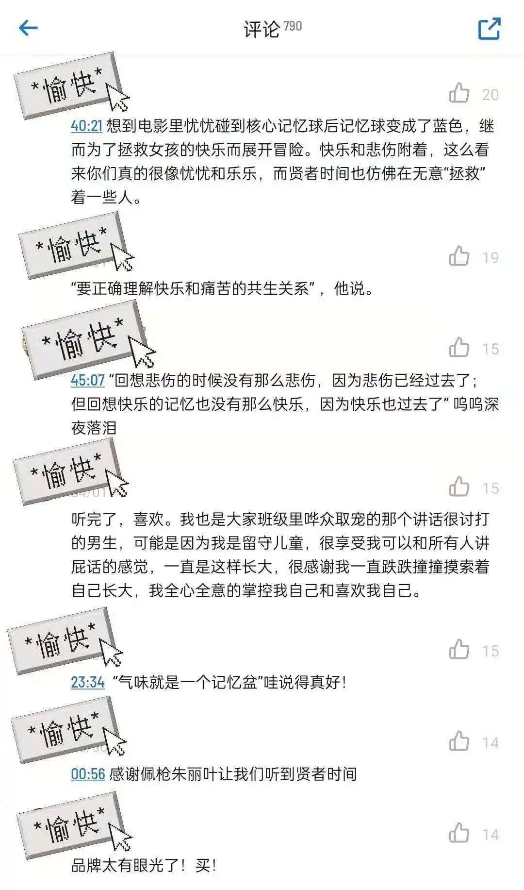 《贤者时间》则是一档由普通人的视角观察普通人的播客,也是小宇宙里第一个期期 99 +评论的节目。主播是两位在北京打拼的挚友,她们之间自然真诚相处细节吸引了诸多听众,也成为了情绪类消费品的良好营销场域。在佩枪朱丽叶的投放单集收到评论 790 条,听众们在评论区分享自己的情绪,也同时表达了对于品牌品味的欣赏。
