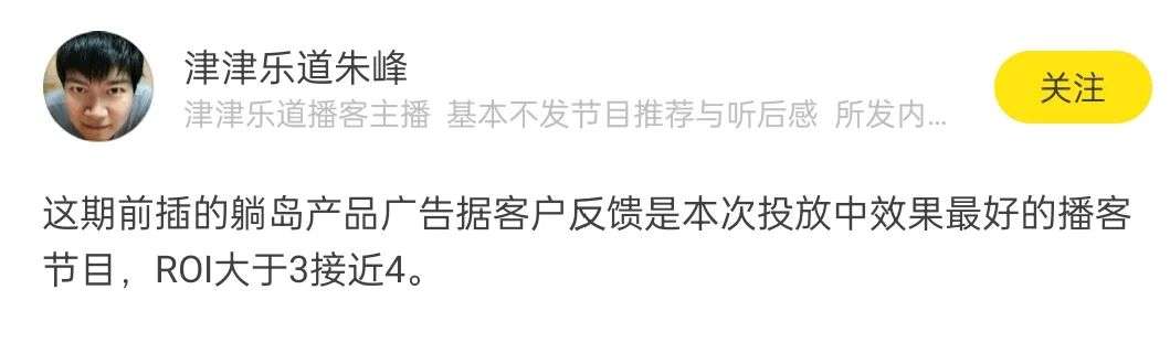 根据《津津乐道》的主播朱峰反馈,躺岛在津津乐道上投放的 ROI 在 3 - 4 之间,后者成为该轮投放中效果最好的播客之一。