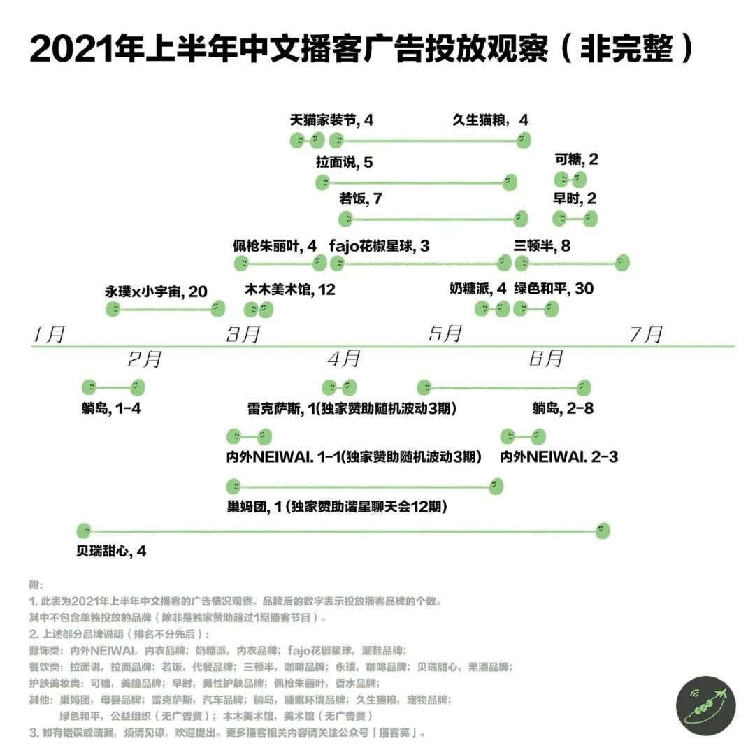即刻用户“我不跑调”整理的2021年上半年中文播客的广告投放观察(非完整),刀法已获其授权