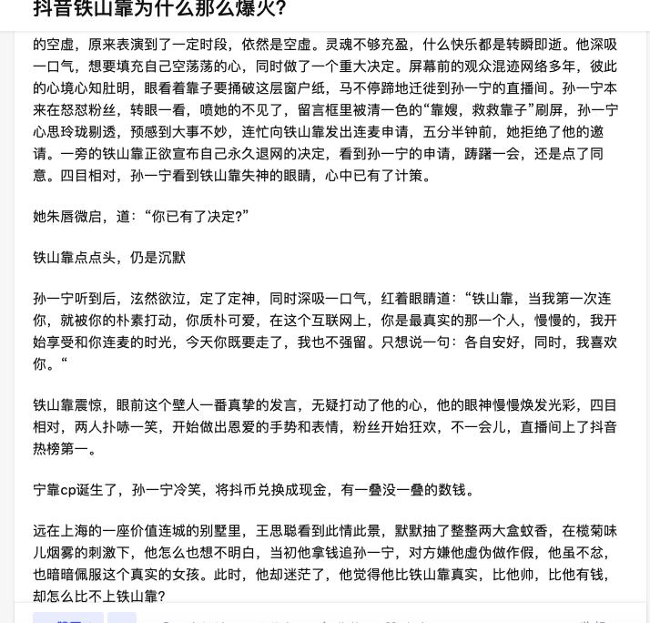 2、对孙一宁来说,解决了直播间总是出现的黑料的问题,找到了新的流量密码和财富密码——是的,拒绝王思聪的孙一宁,通过和铁山靠的“连麦cp”成功维系了人气和流量,也成为抖音平台近期的热点内容之一。