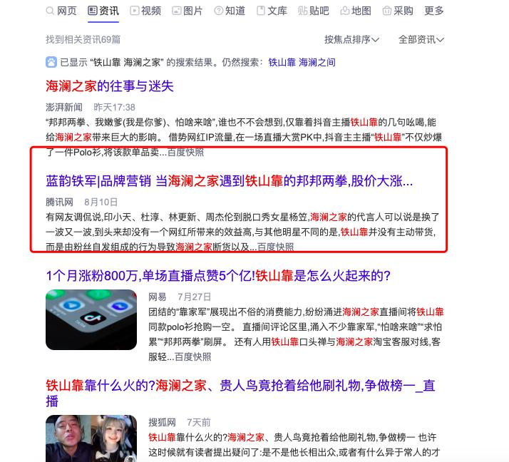 事情其实很简单,应该也不会是品牌方的主动策划。在从快手到抖音的一次直播中,铁山靠穿了一件海澜之家的衣服,于是外界认为可能是两者合作,于是第二天海澜之家股价大涨。之后分析原因发现源头是铁山靠,于是海澜之家直接到铁山靠的直播间刷了一波礼物,形成了一次成功的借势营销。